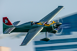 予選12位のマルティン・ソンカとの対戦となったラウンド・オブ・14。予選ではペナルティを受けて順位が低迷したソンカだったが、昨季最終戦で表彰台に立つなど着実に力をつけている。そのうえ、エッジ540 V3を操るソンカはV2の室屋に比べて機体のアドバンテージもある。率直に言って、予選順位から想像するほど分のいい相手ではなかった。
