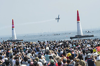 日本航空スポーツ史に残る初のレッドブル・エアレース開催。日本民間航空発祥の地でもある千葉の海浜に、同エアレース史上最多動員という、のべ12万人の観客が押し寄せた。ラウンド・オブ・14で室屋はソンカと対戦、今大会最速の50秒779を叩き出しラウンド・オブ・8へ。続くボノムとの対戦でも果敢にプッシュしたが、オーバーGによるDNFで敗退。