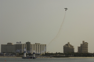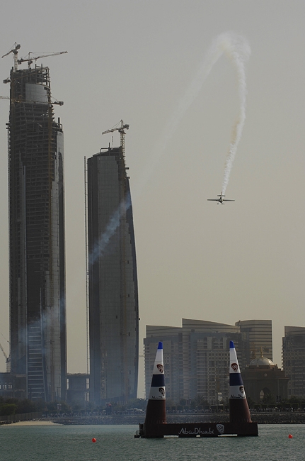 アブダビの高層ビル群を背景に室屋機が舞う!