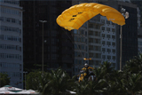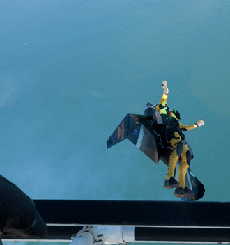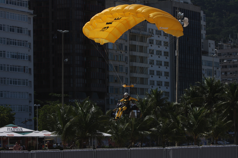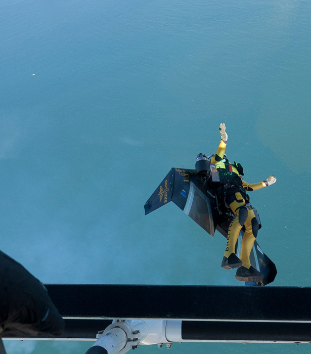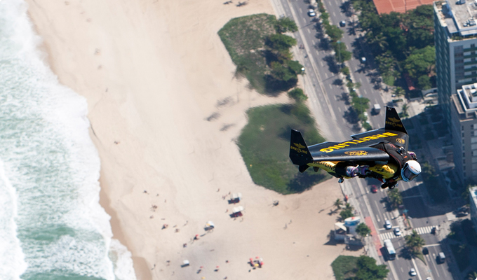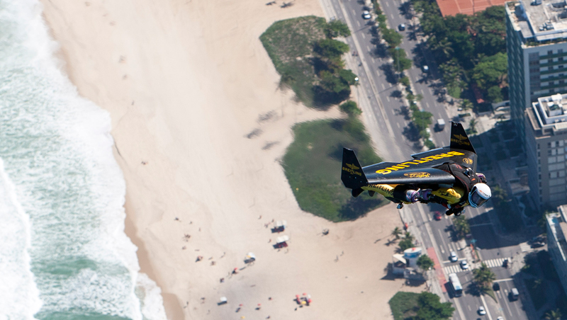 固定式の翼と4つのエンジンを背負い、ヘリコプターに乗ったジェットマンは、ロドリゴ・デ・フレイタス湖(Lagoa Rodrigo de Freitas)上空まで行くと、背中から後ろ向きに倒れるような格好でヘリコプターを離れた。空中でジェットエンジンを点火後、すぐに体勢を整えた彼は、コルコバードの丘(Corcovado)をぐるりと回った後、イパネマ(Ipanema)、コパカバーナ(Copacabana)、ポム・ヂ・アスーカル(Sugar Loaf Mountain)を通過。思うがままに空を駆け抜けた後、色鮮やかな黄色いパラシュートを広げ、コパカバーナ海岸に着陸した。晴天の下、11分35秒のフライトを終えたジェットマンの顔には満面の笑みが広がっていた。