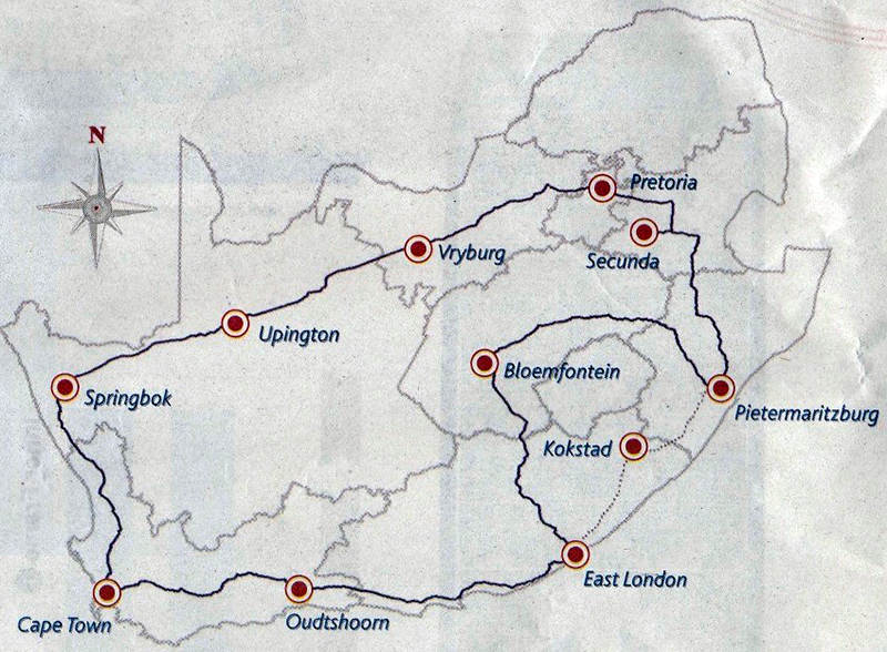それでも晴れていたことが幸いし、ひたすら走行を続ける。もう雨の心配はない。ゴールの地、プレトリアの文字が書かれた標識が見えてきた。ここからは1日目のスタート時同様、交通量の多いハイウェイに入ったが落ち着いた走行を続け、スタートから4時間後、ついにゴールのプレトリアに到着した。
