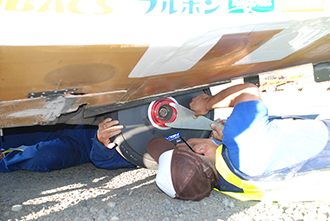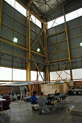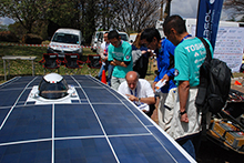 大会側から用意された作業場でソーラーカーの最終調整を受ける。