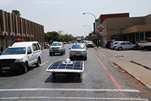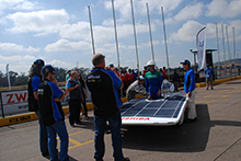 9月18日、スタート地点にはソーラーカーをひと目見ようと多くの観客が集まっていた。賑わう観客たちとは裏腹にチームメンバーには張り詰めた空気が漂う中、スタートを切った。スタート地点を過ぎてしばらくするとすぐに高速道路に突入。通勤車がひしめき合う道路では、スピードをうまくコントロールしながら進まなければならない。ソーラーカーレースでは、先導車、ソーラーカー、司令車の3台が列をなして走行することが決められている。だがレースが行なわれているとは知らない一般車は先導車とソーラーカーの間に平気で割り込んでくる。重量が150kg程度のソーラーカーが一般車に追突されてはひとたまりもない。交通量の多いエリアの走行において、一般車との衝突が一番怖いとチームメンバーは話す。