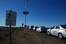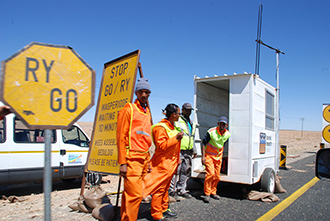 しばらく進み続け一般道に出ると今度は道路工事のサイン。対向車線側が工事中のため、一方の車線の車を通行させるため、もう一方の車線は一時停止しなければならない。そして標識に書かれていたのは「約15分お待ちください」の文字。思わず目を疑うようなアバウトでいて、のんきな指示だ。篠塚は「発展途上にある南アフリカでは現在道路の舗装が常に行なわれており、こうした不可抗力による時間のロスはこの国ならではといえるかもしれない」と話す。大会中、チームが道路工事による約10~20分の一時停止に何度も遭遇したことはいうまでもない。