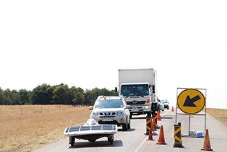 それでも約80km/hをキープしながら走行し、ようやく中間地点のコントロールポイントに到着。「ここでは30分間、車を停止させなければならない。この間にドライバーの交代や先導車や司令車の給油、ランチの買い出しなどを済ませ、後半のレースに備える」と篠塚。ここでドライバーは篠塚から大嶋に交代。そこに大会運営側から連絡が入った。後半のルートは未舗装の道路が多く、道路の大小のくぼみなどに注意して走行するようにとのこと。実際そのルートに差し掛かると想像していた以上の悪路にチーム一同驚かされる。車線全体を覆うような大きなくぼみが断続的に現れる。「我々のマシン「シノワン」は3輪のため、道路の真ん中のくぼみはきちんと避け切らないと後輪が引っ掛かってしまう。避けるために対向車線に出なくてはならないときもあり、またバッテリーを効率よく使用するためには徐行運転を極力しないように進まなければならない」。先導車はソーラーカーにできる限りくぼみの箇所や大きさを無線で伝えながら、避けて走行する指示を出さなければならないのだが、あまりのくぼみの多さに指示が間に合わなかった。