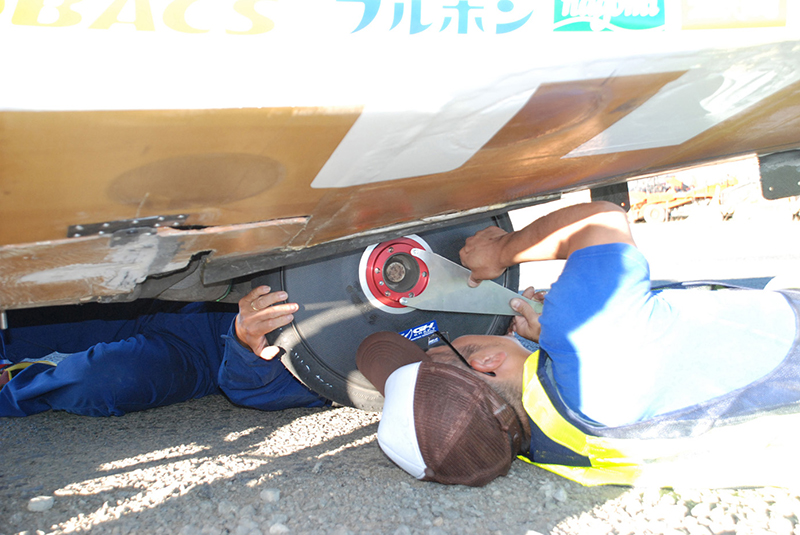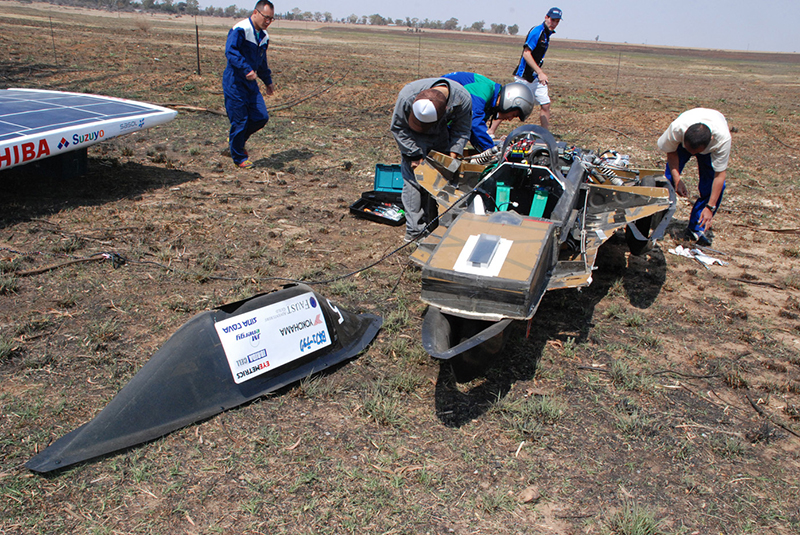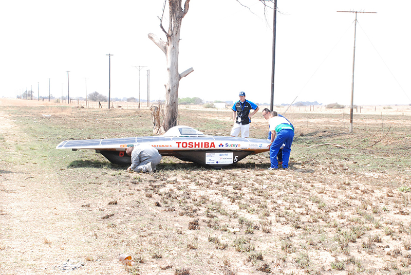 レースも終盤に差し掛かった大会8日目にそれは起きた。その日のコースは、イーストロンドンからブルームフォンテーンの559kmの距離を走行予定だった。前半は登り坂の多い山岳コース。ソーラーカーのスピードが上がらない。約40~50km/hで我慢の走りが続いた。ようやく到着したコントロールポイントでは、大会側から先にあるスミスフィールドという町で大々的な道路工事が行なわれていることを伝えられた。注意して走行することにして進んでいくと、工事現場を迂回するため、砂利道を通らなければならない箇所に差し掛かった。「シノワン」のタイヤは走行抵抗を極力下げるため、バイクなどで使用されるタイヤ(*現在開発段階のサンプル)を使っており、砂利というより大きな石がごろごろ転がっている道の通行にパンクは避けられなかった。