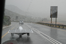 だが大会中は晴れた日ばかりではなかった。雨天の際は、雨水が当たらないよう電気系統にはポリエチレンのフィルムで作ったカバーをかけるが、ドライバーはハッチの隙間やタイヤからの巻き上げで車内に入ってくる雨水でびしょ濡れになることもある。ワイパーがないため前方の視界は悪いし、滑りやすくなった路面を走行するのに神経を消耗する。唯一雨の功名とは、ソーラーパネルの表面温度を下げ、発電効率をアップさせてくれることである。