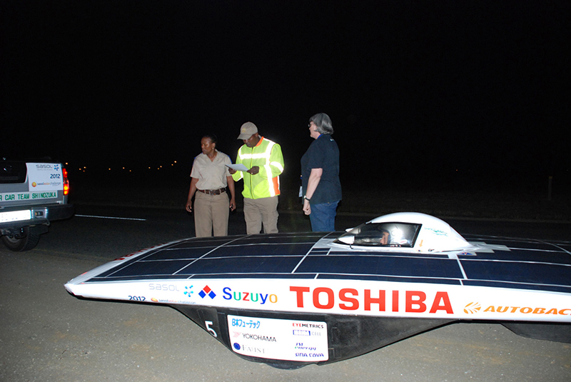 砂利道で徐行を強いられ、さらにパンクの修理などに時間を費やしたため、再び走り出した頃には、日が落ちかけていた。18時を過ぎたところでフィニッシュラインのブルームフォンテーンまで約40km。あたりは無情にも暗くなってきた。日が落ちた後でのソーラーカーの走行もドライバーを悩ませるという。「車高の低いソーラーカーにとって、ただでさえ視界が悪くなる上に、対向車のライトが反射してしまい前方が見えにくい。衝突を避けるためにも速度を落とさなければならなかった」と大嶋。