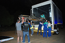 残り31km地点。突然パトカーが近づき、チームに止まるよう指示した。警察はかなり興奮したようで、「なぜこんな車が公道を走っている!?誰の許可を得ているのだ!」とどなり立てる。ボランティアのメンバーが大会側から渡されている許可証を見せながら説明するとようやく状況を把握したが、やはり夜間の走行は危険だと主張。やむなく、マシンをトラックに積み込み、この日の残り31kmを走行することは叶わなかった。「規定距離を走破することを目標としていたチーム篠塚にとって、これまでマシントラブルや天候に左右されながらも走破してきた記録が初めて崩されてしまった」と篠塚は悔しさをにじませる。