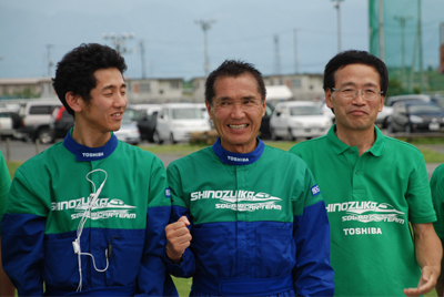 左からドライバー兼エンジニアの大嶋健一氏、チーム代表兼ドライバーの篠塚建次郎氏、監督の山田修司氏