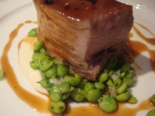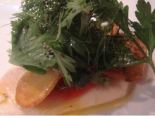 いささか拍子抜けしているところに、感じのいい美人が「アペリティフは何にしましょう」。まずはグラスのシャンパーニュで一息。そうそう、料理はシェフのお任せコースのみ。気がつくと、静かな店内はあっという間に満席。そしてシャンパーニュが体に沁みこんだところで料理が次々に運ばれます。