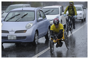 5月4日、札幌にて大雨の中、車いすレーサーの鈴木良美さんが歯を食いしばって走る。
