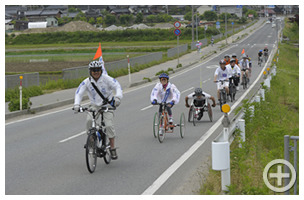 「障害者日本縦断駅伝 完結編」(朝日新聞後援)は2012年4月28日に震災復興支援のため、宮城県庁舎からスタートし、北上。翌日には南三陸町の防災対策庁舎跡をはじめ、被災地を走った(写真)。