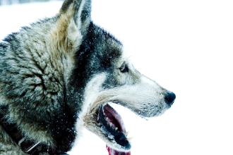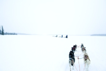 F ちょうど吹雪で、すぐ先が見えなくて。顔がこわばって「カキクケコ」も言えなくなるんです。犬のハアハアゼイゼイ言う、その音しか聞こえない。何も見えない、ひたすらの雪野原。犬ゾリって思ったより速いんですよ、時速20㎞くらいは出ていたんじゃないかな。時々犬のために休んであげるんだけど、とたんに犬たちは雪を食べたり、ゴロンと寝転がって雪に身体をなすりつけたりする。冷やしているんでしょうね。その懸命さを見ると、だんだん犬に愛情が湧いて来るんです。それにこの犬たちは、走るのが好きだからなんでしょうけど、犬ゾリに繋がれた瞬間に凄く興奮して「ウオオオオオオオ!」って怖いくらいに叫ぶ。でも、犬使いのおじさんが「ウワウウ、ウウワウウウ!」って言った瞬間に、ピタッと静かになる。「シャラップ!」とかじゃなく、「ウウ〜ウウウウ〜」って話している、そういう感じなんです。