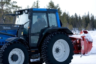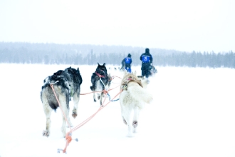 氷のコースでのドリフト練習、スノーモービル、ゴーカート、S字コース、犬ゾリ、レース…。次から次へと展開するアクティビティに、顔を上気させながらスリルと興奮を味わい、合間にはしっかりハメも外し、大声を張り上げていたファウストたち。目の前に広がるのは見渡す限りの雪の平原。空には痛いほど眩しい北の国の白い太陽。時折トナカイにひょこり出くわす他は、誰にも出会わない。聞こえるのは自分の息づかいと、エンジン音や犬の吐息だけ。途方もない景色の中で彼らは何を感じたのか。