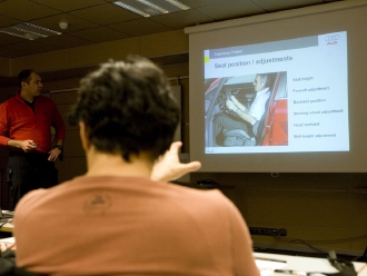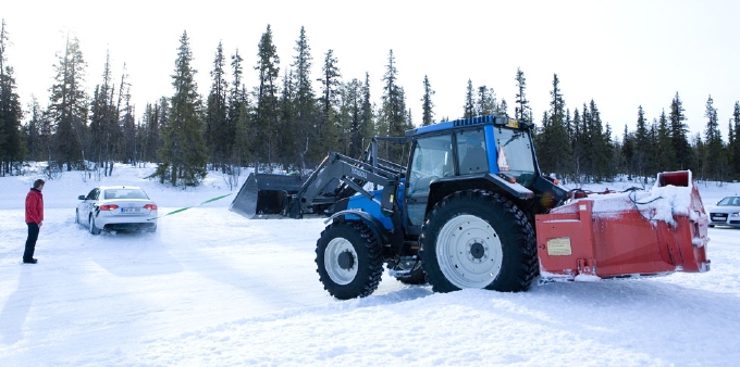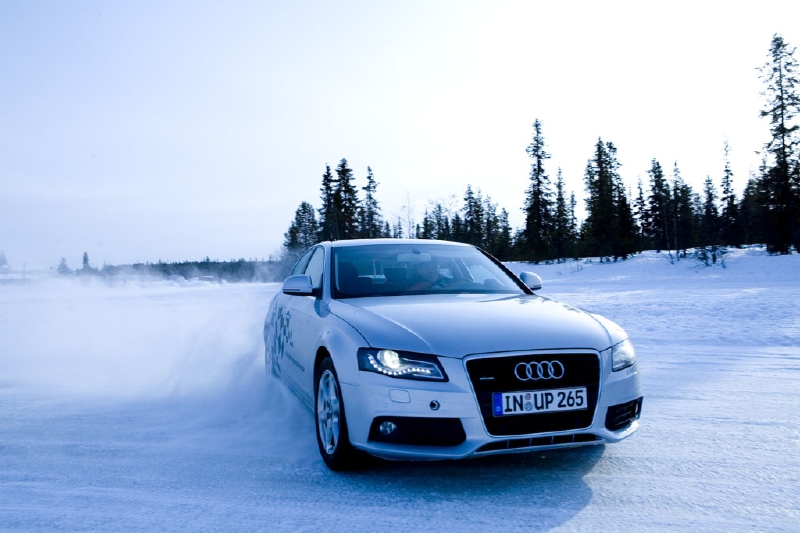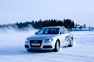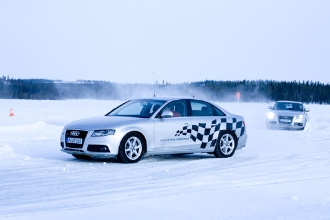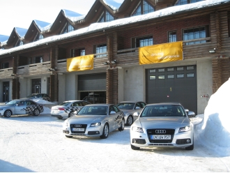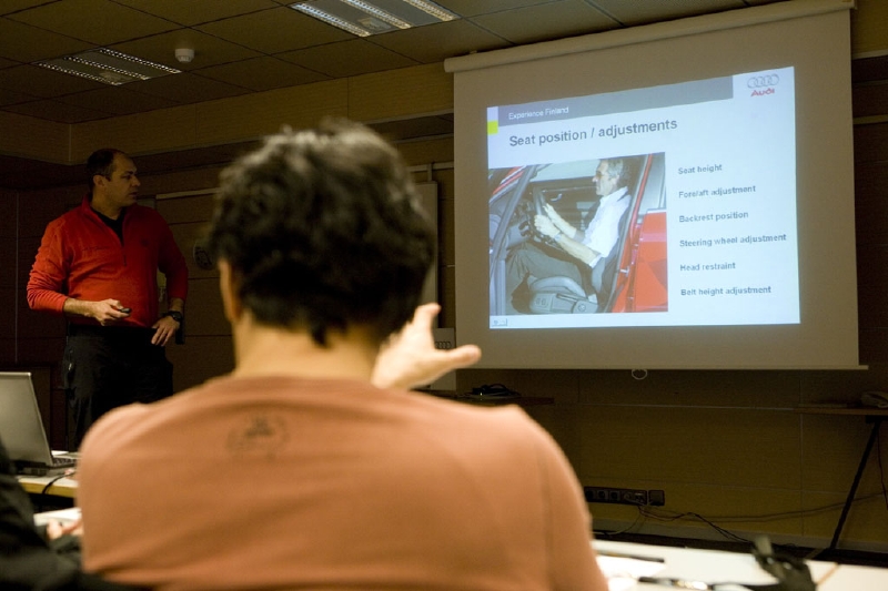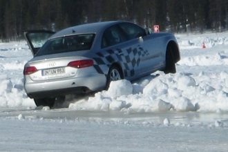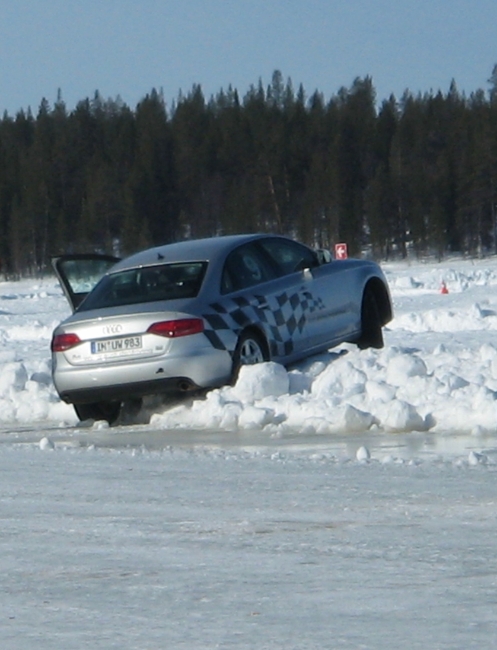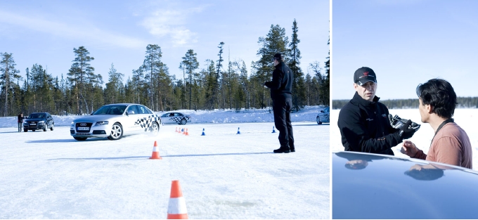 勢い込んでレクチャー室を出たものの、早くも最初の試練が訪れた。ホテルのガレージで、アウディの新型A4に一人ひとり乗り込み、レッスン会場となるサルキロモポロ湖へ向かうのだが、当たり前のように、道路はもれなくアイスバーン。急こう配での一時停止で、早くも1台がエンストの洗礼を受けるはめに……。
