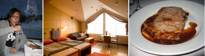 左:ホテルにて夕食でくつろぐFaustの高下。 中:ホテルの部屋は、シンプルな造形にナチュラルな質感、ときにポップな色使いから、北欧のデザインセンスが感じられる。 右:サーモンなど魚介の前菜や牛肉のグリルとワインを楽しむ。