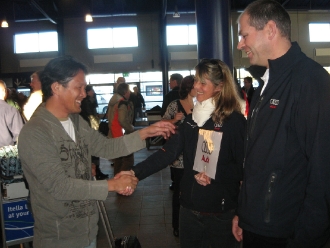 左:湖上にコーンを配した8の字コースをこなしていく。 右:austチームのメインインストラクターのヤン・ベッカー氏と堀。