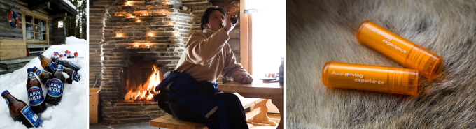 ホテルへ帰る前に、ログハウスで休憩。暖かな暖炉の炎、室内にはキャンドルが灯され、穏やかで温もりあふれる雰囲気の中、温かい飲み物とスイーツで一息。 左・中:次に用意されていたのは、芯まで冷えた身体に嬉しいサウナ。その中では雪で冷やしたビールで乾杯! この北極圏流がたまらない。身体がみるみる生き返る! 右:ふと気づけばさりげなく、オリジナルのリップクリームまで置いてある。「ゲストの到着ジャストに合わせ、先回りしてすべてさりげなく用意されている! このホスピタリティは感動ものだよ」と堀。