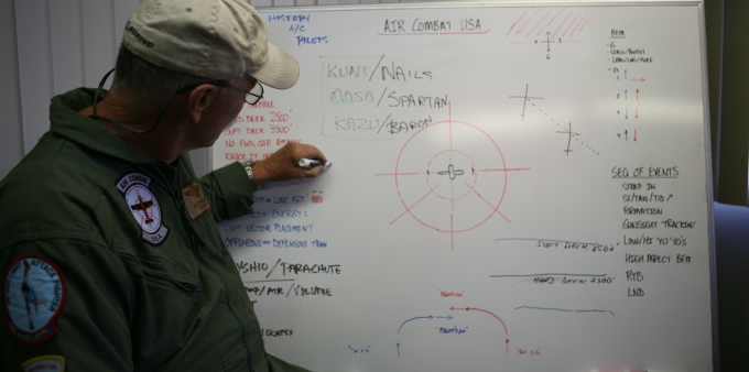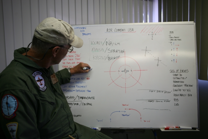 部屋を移して、ネイルスによるブリーフィングが始まった。ホワイトボードにはなにやら飛行機のフォーメーション図や照準が描かれている。「戦闘機に乗る」ことはわかっていても、初めてのことのため果たして空中ではどのような世界が展開するのか、ここまできても今一つ“掴みきれていない”感があった。