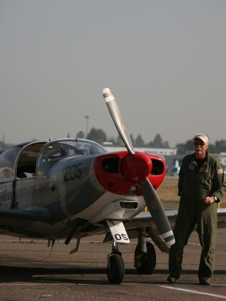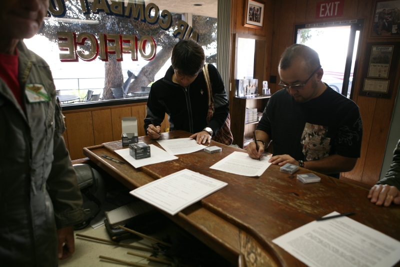 上:滑走路脇に待機する戦闘機The Extra 300L。パイロットが整備状況をチェックしていた。下:「フライト中のいかなる事故に対し、自己責任を負う」という旨の書面に署名をする。