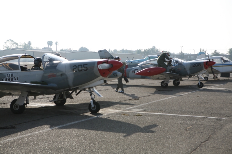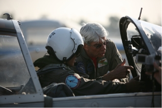 戦闘機の翼を踏み台に、やや緊張の面持ちで、それぞれのコックピットへと身を滑り込ませ、パイロットとともにトリガー、照準など操縦方法の確認をする。