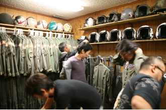 右:フライトスーツとヘルメットがずらり。フライトスーツを着ると、気分にスイッチが入る。