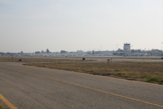 管制塔とメインゲートは滑走路の向こう側。エア・コンバット社のオフィスは飛行場の一番角に陣取っている。