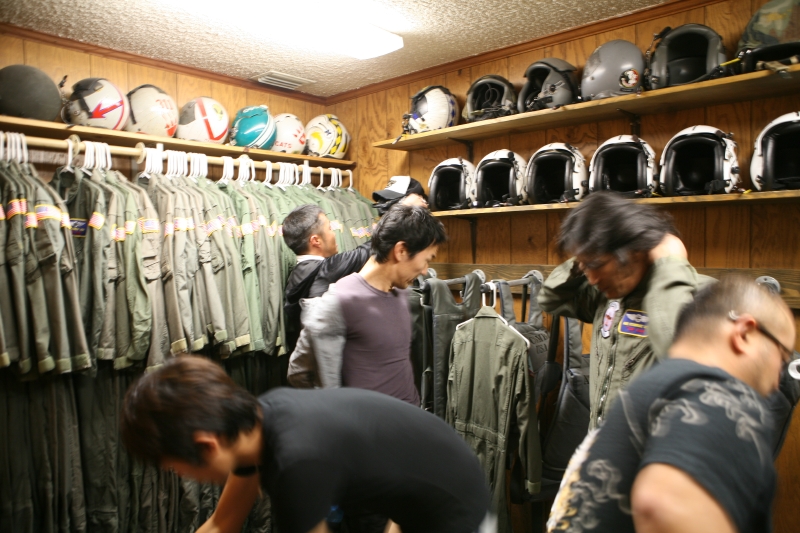 狭い通路を通り奥の部屋へと通されると、上腕部にアメリカ国旗が縫い付けられたフライトスーツと、鷹や矢印など様々なマークがペイントされたヘルメットがずらりと並んでいた。Faustたちは上下アンダーウェア一枚になって、つなぎのフライトスーツに足を突っ込み、そでを通し、ファスナーをジャッ!と首元まで上げる。スーツが全身を包むと、、、空気がガラリと変わった。「この姿で戦闘機に乗るのか」と、じわりと実感が沸いてきているのだ。