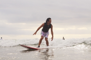 沖合へパドリングしていった國分は、すぐに波をつかまえていく。最初の数本こそ立ち上がるだけにとどまっていたが、しばらくするとボードを操れるようになっていく。足の痛みがあることで無駄な力が入らず、リラックスしたライディングとなっているようだ。