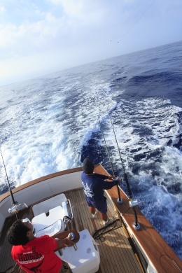 F:それはもう。歴史は長いし、ビル・フィッシャーにとっては憧れのトーナメントですから。いつかは自分のチームを率いて出場したいというのがカジキ釣り始めて以来の夢でした。それが去年、偶然ヒルトン・グランドバケーション・チームのメンバー募集を見つけてトントン拍子に話が進んだ。こんなに早く出場できるようになるとは思ってもいなかったので、決まった時には夜も眠れないくらい興奮しちゃいましたよ(笑)。実は、日本でカジキ釣りをする時は、僕はアングラーはやらないんです。自分の船でチームを率いているので、僕はもっぱら操船と司令塔役。それはそれで性分にあっているし好きなんですが、やっぱりビル・フィッシャーとしてはアングラーが一番楽しい。HIBTに参加すればアングラーができるのも大きな魅力でした。