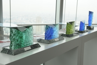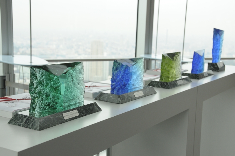 ガラス造形作家の渋谷良治氏の手による受賞トロフィー。