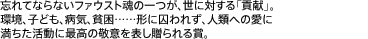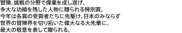 世界中の「冒険・挑戦・貢献」を称える初の試みとなった、ファウストA.G.アワード2009。今回は4名が受賞されたが、世界にはまだまだ、我々が想像もできないようなことに挑む、あるいは挑もうとしている挑戦者、冒険家が、多数活躍しているに違いない。今後、果たしてどんな冒険を、挑戦を、貢献を目にすることになるのだろうか。