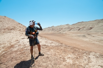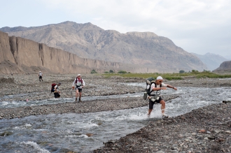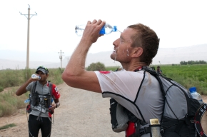 3日目は山岳地帯を下っていく。前半はごつごつした河原の石の上や、川の中を横切るコースで、みるみる足にダメージが蓄積していく。日差しは強いものの、乾燥しているため気温はあまり上がらず、周囲の緑を眺めながらリラックスして走ることができた。しかし、後半は荒涼とした大地がどこまでも続き、疲労からか集中力が散漫になり、足には少しずつマメができはじめている。