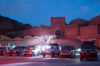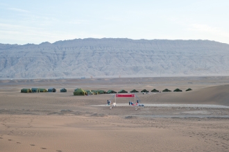 バスに揺られ、東に150km。悪路に悩まされながら、スタート地点である砂漠地帯へと移動する。午後11時を過ぎた頃、ようやく世界で2番目に大きな塩湖があるトルファンの街が見えてくる。郊外の村に設営されたキャンプサイトで、レース前の英気を養うのだ。