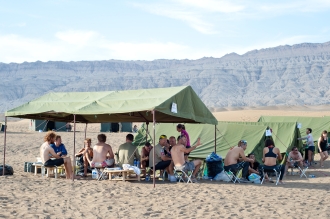 砂漠の中に突如キャンプが現れる。その日のゴールであり宿営場所だ。