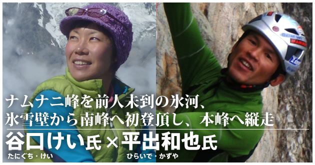 2011年10月、谷口氏と平出氏のふたりは、西チベット最高峰のナムナニ峰(7,694m)において未踏の南面渓谷と氷河を踏査。氷雪壁を登攀して南峰に初登頂し、そこから本峰への初縦走に成功した。ナムナニ峰への登頂は1905年から挑まれていたものの、初登頂は1985年の日中合同隊まで待たなければならず、その後も登頂に成功した登山隊は数隊のみという難峰である。それにもかかわらず、両氏は一枚の写真を手掛かりに、現地での南面踏査により未踏のルートを見出し、アルパインクライム(岩や氷の壁を人力で登攀するスタイル)で登頂することに成功した。