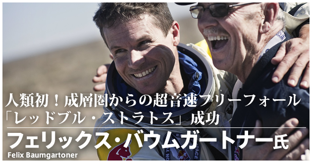 アメリカ・ニューメキシコ州ロズウェルにて、今年10月14日(日本時間15日)、成層圏からのフリーフォール(スカイダイビング)プロジェクト、「レッドブル・ストラトス」を成功させた。このプロジェクトは、宇宙飛行士を思わせるスペーススーツを着用し、巨大ヘリウム気球に吊り下げられたカプセルに乗って上昇。2時間ほどの後、成層圏内の予定高度に達し、カプセルから飛び降りてフリーフォールするというもの。約50秒後には落下速度が音速を突破。4分19秒後にパラシュートを開き、無事着陸に成功した。