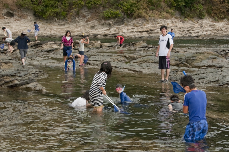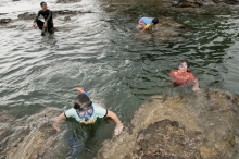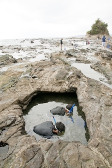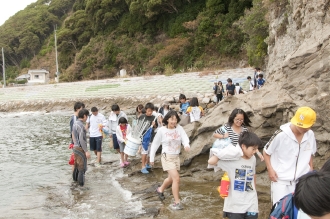 鴨川の隠れスポットまで、磯を歩いて向かう。「去年はもっと波が静かだったね」という声も。準備が整ったら、木村氏から説明と注意を受けて、いざ、海の中へ。