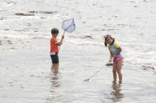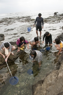 海で冷えた体を浜の焚火で温めては、再び海にチャレンジする。網を片手にじっと魚を狙っていた糸見が、美しい熱帯魚を捕まえると、子どもたちはわっと歓声を上げた。少しずつバケツに増えていく魚たちを見ながら、