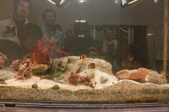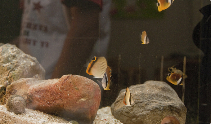アメフラシやチョウチョウオ、色とりどりの魚たちがアクアリウムの中に入ると、パッと華やいだ海の景色がそこに広がる。
