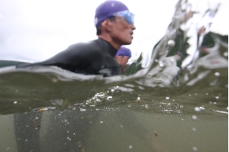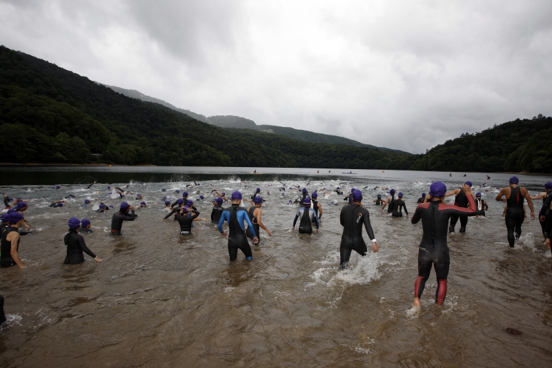 F あそこは“魔の丸沼”とか呼ばれているんです。今日も、アイアンマンに出るような凄い実力の方が、息が上がってロープにつかまっていました。そんな方でも、「ここは息が詰まる」と仰るんです。そういうことを聞いていると、やっぱり怖くなる。でも、昨日軽く泳いだ感じでは、水がいい意味で重い、受け止めてくれる重さがあるので、すごく泳ぎやすかった。それに、塩水じゃないので楽ですね。あれだけ分厚いウェットスーツを着ていれば、身体は浮きますし。今日は本当に気持ち良く泳げました。人数が少ないから、ドラフティングもクラッシュも、バトルもないですから。