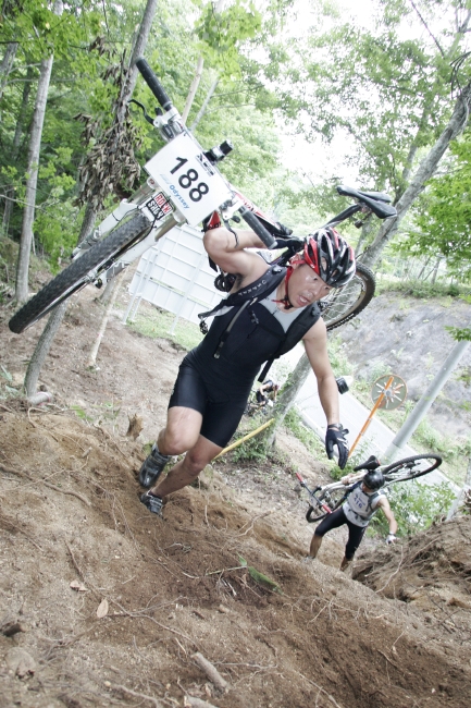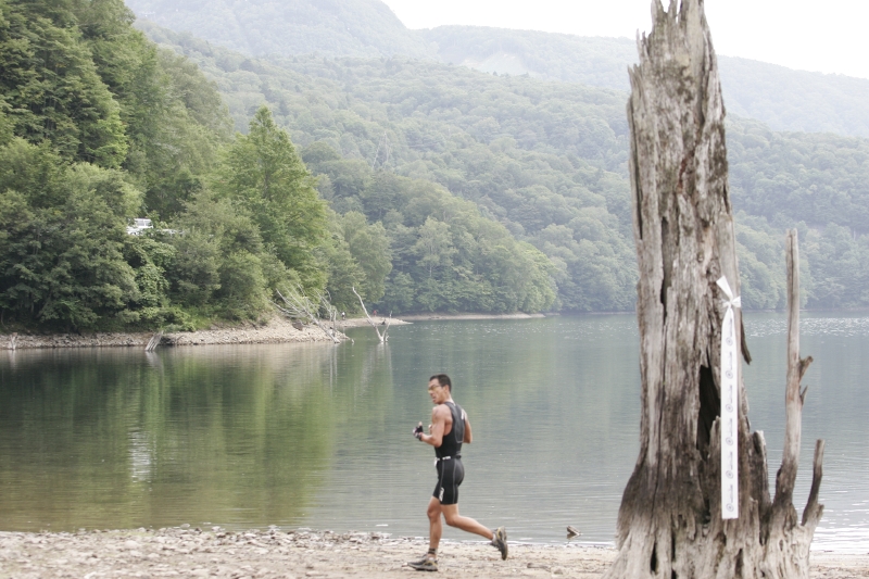 F バイクに比べれば、ランはそれほどでもないというのが僕の感覚でした。ただ、トライアスロンでもそうなんですが、バイクからランへのトランジッションのときに、ものすごい筋肉痛になるんです。誰だってそうなんでしょうけれど、とにかく足が痛い。しかも、トランジッションを終えた瞬間に湖畔沿いの砂利道をずっと走るコースで、ようやく終わったと思ったらいきなりロープを伝って上がる。そこがキツかったですね。死ぬかと思いました。
