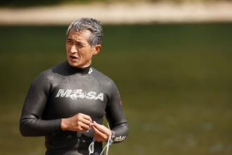 およそ15分後、辻が岸に上がってきた。水分をたっぷり含んだウェットスーツは、泳ぐ前より色を濃くしている。