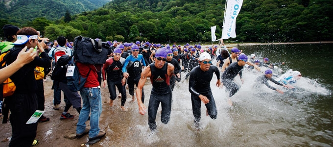 5、4、3、2、1……静寂を切り裂くホーンの音とともに、競技者たちが弾かれたように湖へ飛び込んでいく。スタート直後はひと固まりだった集団が、またたく間に細長い線になっていく。