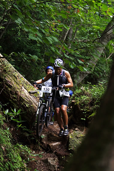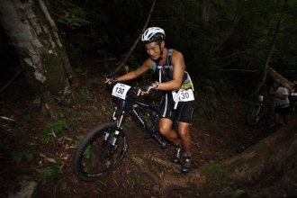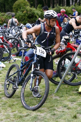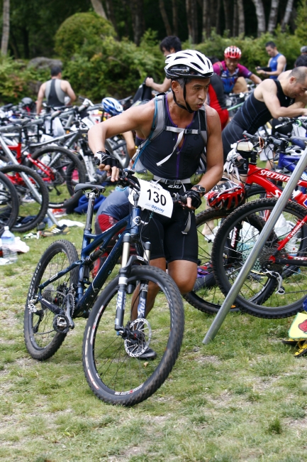 スイムから上がり、トランジッションでMTBの装備に身を包み、山岳コースへ。