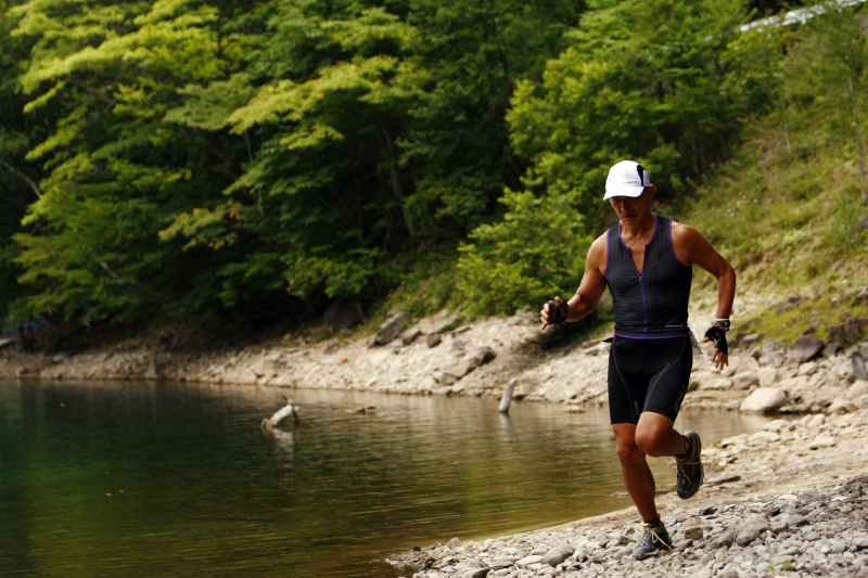 「トライアスロンでもそうなんですが、バイクからランへのトランジッションの段階ですでに、ものすごい筋肉痛なんですよ。誰だってそうなんでしょうけれど、とにかく足が痛い。しかも湖畔の砂利道をずっと走って、それが終わったらと思ったらロープを使って登らなきゃならないし……死んでしまうんじゃないかというぐらい、本当にキツかったですねぇ」