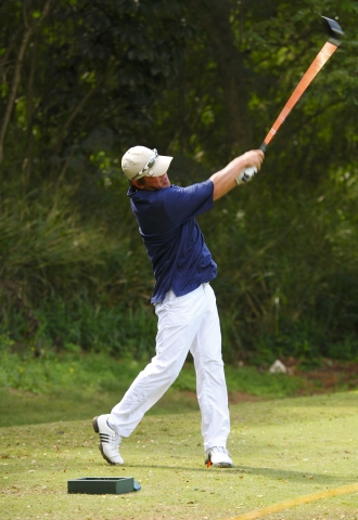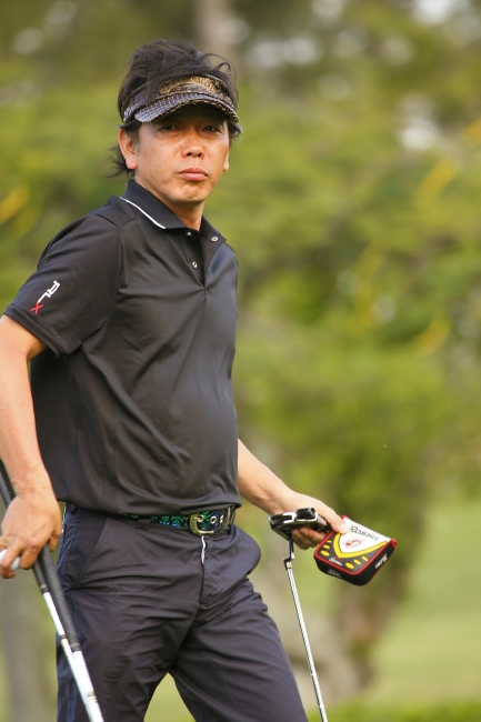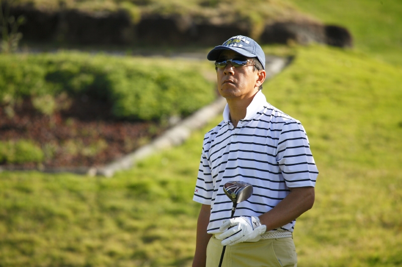 前日の調子が良かったせいか、スタ-ト前は笑みもこぼれていた。1番ホール パー5、ティーショットは、わずかに左ラフに入るが、距離は同組のバリー、190cmの選手たちに引けをとらない。セカンドをグリーンエッジまで運ぶが、バーディーパットをはずしパー。5番のパ-5ではバ-ディを奪って、テンションも上がった。だが、パッティングの調子が上がらない。