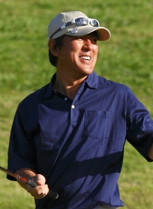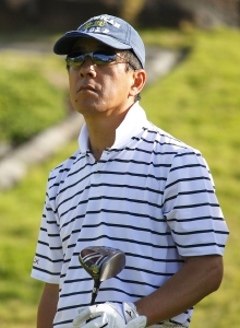 ファッション・プロデュ-サ-である浅野は、41年前にゴルフを始め、3人の中では一番スコアも安定している。距離にこだわりを持ち、ドライバ-には自信がある。この日のティ-ショットも安定し、ミスかと思えたのは4番ホ-ルだけで、あとはほぼ完璧に近い状態だった。5番ではバ-ディ-を取り、「さらにドライバ-が良くなった」と、調子を上げ、昨年同様、予選突破の可能性を一番感じさせてくれた。