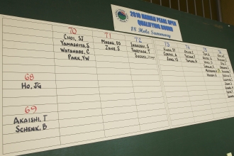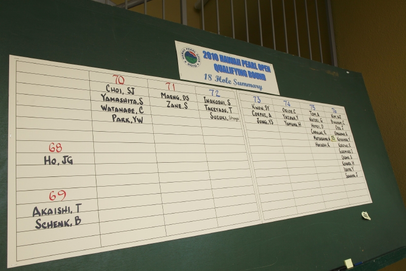 クラブハウスのスコアボ-ド前は、自分のスコアと当落を確認する選手やその家族、関係者でごった返していた。最高スコアは68、カットラインは74だった。「思った以上にレベルが高く、かなり厳しかったね」と、マ-クは言った。